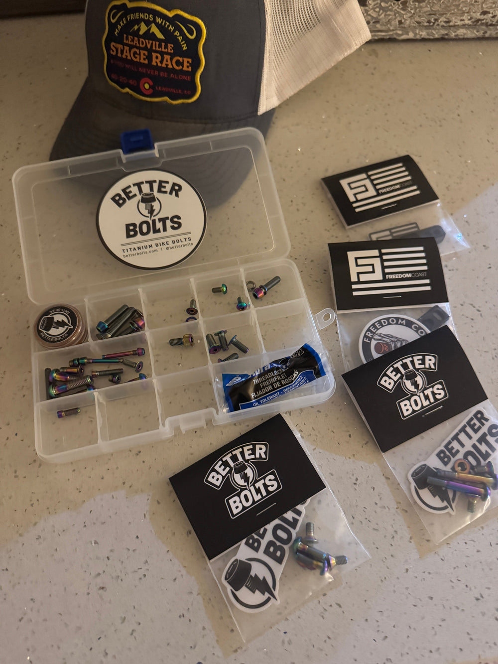Wow, he'd put together a titanium bolt kit for my bike, replacing every single bolt with these super rad oil slick color bolts.