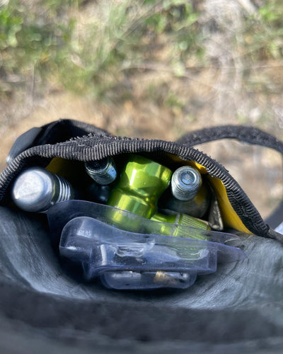 The mini RaceDay bag is super lightweight and durable bag that holds a 2 20oz air cartridges, Dynaplugs, and a multi-tool.